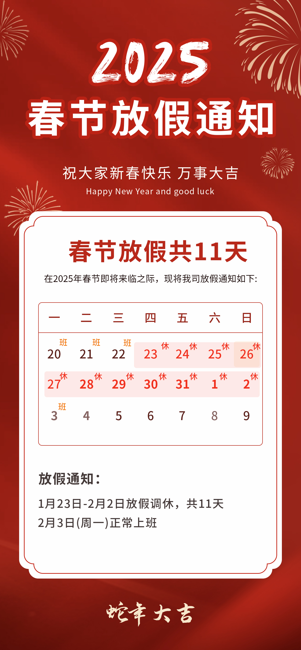正值中國(guó)的傳統(tǒng)節(jié)日"春節(jié)"來臨,在此向各位新老客戶和廣大朋友們拜個(gè)早年!預(yù)祝大家新春愉快!財(cái)源廣進(jìn)!事業(yè)紅火!為了讓公司員工過一個(gè)歡樂祥和的春節(jié),將對(duì)春節(jié)假日提前和延長(zhǎng),現(xiàn)將公司春節(jié)放假時(shí)間通知如下:2025年1月23日(農(nóng)歷臘月二十四)~2025年2月2日(農(nóng)歷正月初五)(共計(jì)11天),2月3日(農(nóng)歷正月初六)正式上班。